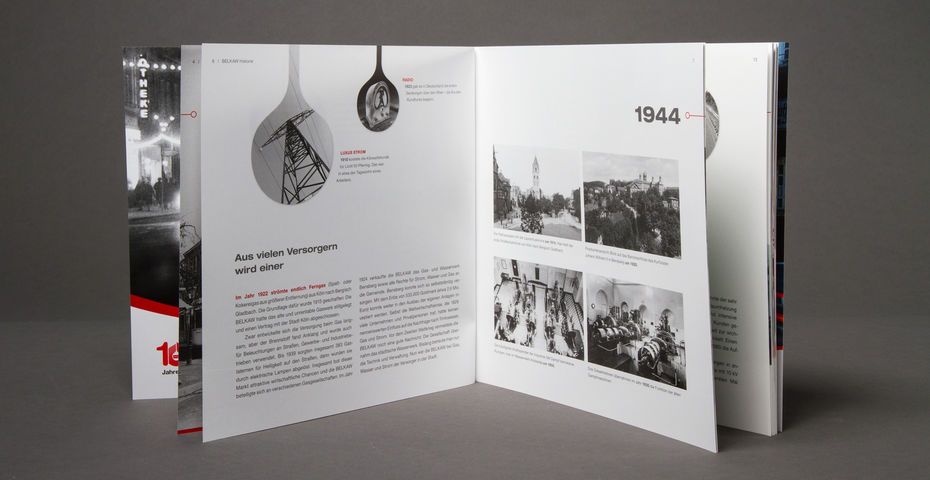 Im Auftrag der Alpha & Omega Public Relations, Bergisch Gladbach, gestalteten wir die Jubiläumsbroschüre, die die Entwicklung des Unternehmens vom Energieversorger zum Energiedienstleister anschaulich erzählt. Ebenso entwickelten wir das Gestaltungskonzept für die Ausstellung zum 100jährigen Bestehen, die während der Jubiläumsfeiern im Foyer der Firmenzentrale gezeigt wurde.