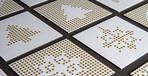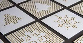 Erinnern Sie sich noch? Memory, das Erinnerungsspiel mit jeweils zwei identischen Karten, die man in einer großen Menge verdeckter Karten suchen muss. Wir haben unsere eigene Version dieses Spiels entwickelt – mit abstrakten und konkreten goldfarbenen grafischen Elementen, die jeweils aus 79 Punkten bestehen. Ein echtes Element-79-Produkt eben.